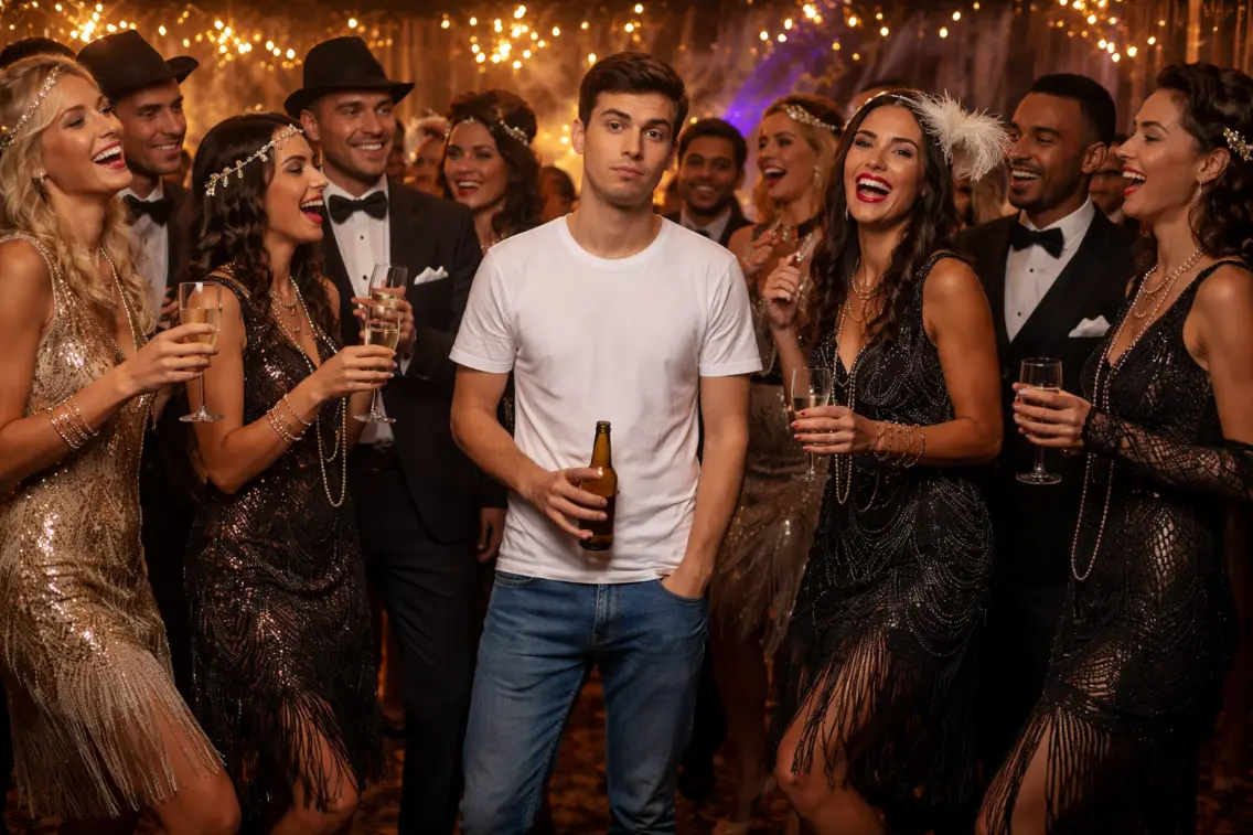 Niet verkleed naar een themafeest...
